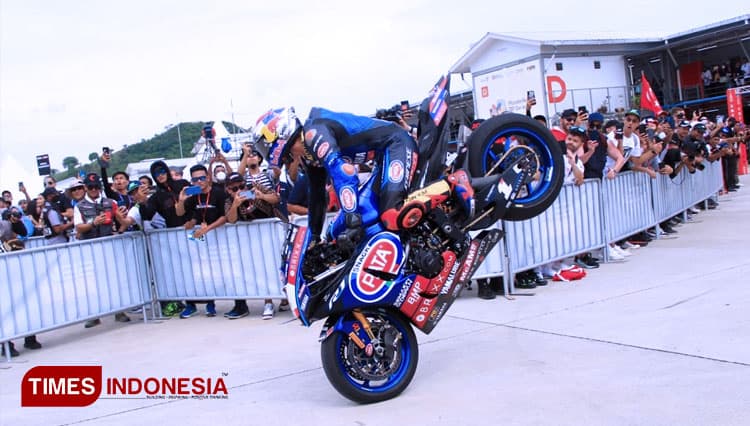 TIMES Purworejo/Pembalap PATA Yamaha Brixx Toprak Razgatlioglu melakukan atraksi stopie ban depan usai memenangi race 1 WSBK Mandalika 2022, Sabtu (12/11/2022). (FOTO: Tria Adha/TIMES Indonesia).